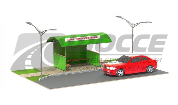 Изготовлен из профилированного металлического листа закрепленного на стальном каркасе с округлой крышей. Каркас имеет защитное антикоррозионное покрытие. Возможен выбор цветовых вариантов профнастила. Укомплектован урной.